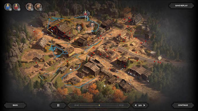 It took me around 1-2 hours to finish each of Desperados 3's 16 available levels, and I'd hazard the last few were closer to 2-3 hours. Each location has three badges and a host of challenges for completing the level in a certain manner: finishing the level under absurd time limits, not using certain abilities, or killing enemies with environmental hazards. Again, the Hitman comparison is apt: Finishing the levels isn't enough, the meat is in returning and doing better next time. When I finished a level in 45 minutes and one of the challenges was to do it in under 5 minutes, 30 seconds, it's like the game was daring me to jump back in. (At the end of each level, Desperados 3 offers a replay diagram of your path and actions, which is a wonderful illustration of one's play time.)